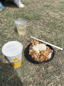 演奏が終わるとフェスの醍醐味、お酒とご飯を食べました。いろんなフードがあってどれにしようか迷った結果タルタルチキンを選びました。
